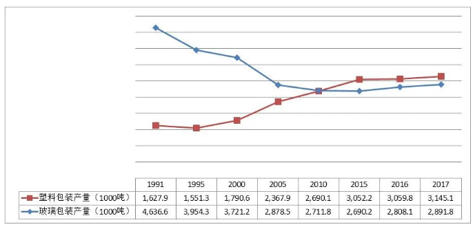 圖 1991-2017年德國塑料包裝、玻璃包裝量變化,數(shù)據(jù)來源:德國環(huán)境部