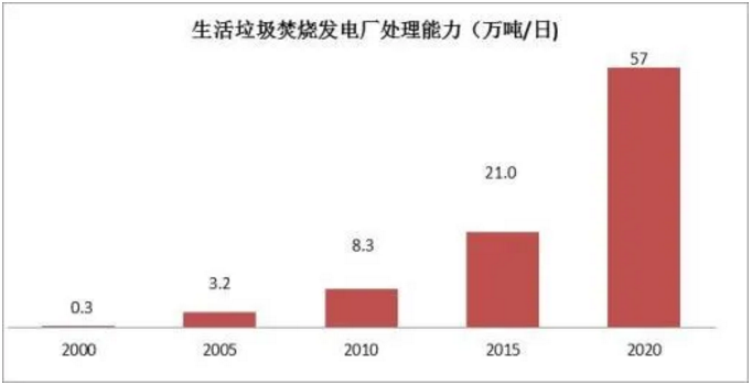 上面兩張圖是我國近年來生活垃圾填埋處理量和焚燒發(fā)電廠處理能力的對比情況,明顯看出國內(nèi)生活垃圾填埋量從2017年開始下降,預(yù)計未來幾年將快速下降,而生活垃圾年焚燒量直線上升,預(yù)計將很快超過2億噸。