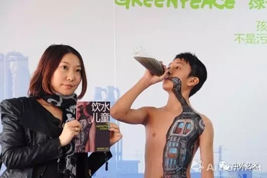 在上海第二屆廣告人藝術(shù)展上,由全球環(huán)保公益組織“綠色和平”等創(chuàng)意展示的行為藝術(shù)--“飲水兒童”讓現(xiàn)場觀眾頗具視覺的震撼,藝術(shù)家通過在模特兒童身上創(chuàng)意畫出宛如人體內(nèi)臟的一個(gè)“水污染處理器”圖案,以此警示,污染飲用水對(duì)人類所造成的無法彌補(bǔ)的傷害,引發(fā)社會(huì)對(duì)水污染問題的關(guān)注和重視。