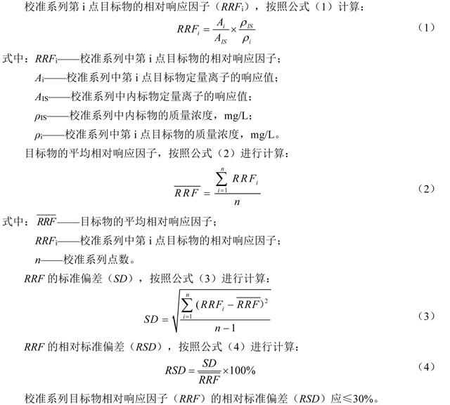 通過樣品中目標(biāo)物與校準(zhǔn)系列中目標(biāo)物的保留時(shí)間、特征離子質(zhì)荷比及其豐度比等信息比較,對(duì)目標(biāo)物進(jìn)行定性。樣品中目標(biāo)物的相對(duì)保留時(shí)間與校準(zhǔn)系列中該化合物的相對(duì)保留時(shí)間的差值應(yīng)在±0.03以內(nèi)。樣品中目標(biāo)物的定性離子相對(duì)于定量離子的相對(duì)豐度與校準(zhǔn)系列中該化合物的相對(duì)豐度比較,其相對(duì)偏差應(yīng)在±30%以內(nèi)。