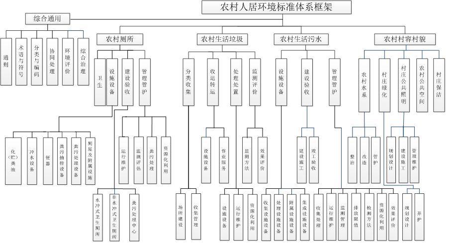 根據(jù)農(nóng)村人居環(huán)境發(fā)展現(xiàn)狀和實(shí)際需求,構(gòu)建內(nèi)容科學(xué)、結(jié)構(gòu)合理的農(nóng)村人居環(huán)境標(biāo)準(zhǔn)體系框架。體系分為三個(gè)層級(jí),第一層級(jí)包括綜合通用、農(nóng)村廁所、農(nóng)村生活垃圾、農(nóng)村生活污水、農(nóng)村村容村貌標(biāo)準(zhǔn)子體系。第二層級(jí)由第一層級(jí)展開,包括6個(gè)綜合通用要素、4個(gè)農(nóng)村廁所要素、4個(gè)農(nóng)村生活垃圾要素、3個(gè)農(nóng)村生活污水要素、5個(gè)農(nóng)村村容村貌要素。第三層級(jí)由第二層級(jí)展開,對(duì)相應(yīng)標(biāo)準(zhǔn)要素作出進(jìn)一步細(xì)化分類(如圖所示)。