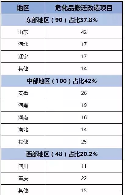 據(jù)了解,工信部、國家發(fā)改委等遴選出的238個危化品搬遷改造項目,按區(qū)域劃分,東部地區(qū)有90個,占項目總數(shù)的37.8%,中部地區(qū)有100個,占項目總數(shù)的42%;西部地區(qū)有48個,占項目總數(shù)的20.2%。