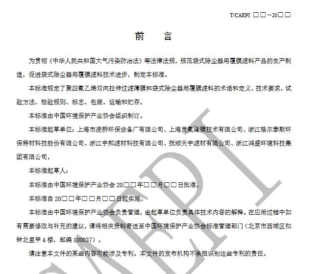 關(guān)于征求中國環(huán)境保護(hù)產(chǎn)業(yè)協(xié)會標(biāo)準(zhǔn)《袋式除塵器用覆膜濾料》意見的函
