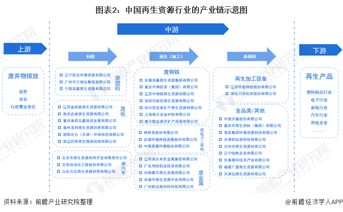 再生資源產(chǎn)業(yè)鏈涉及范圍較廣、產(chǎn)業(yè)鏈上各細(xì)分產(chǎn)業(yè)呈現(xiàn)分散化。從“回收-再生-再利用”的全產(chǎn)業(yè)鏈角度分析,再生資源行業(yè)的上游是廢棄物產(chǎn)生、排放;產(chǎn)業(yè)鏈的中游包括廢物回收、再生和再利用三個(gè)環(huán)節(jié);行業(yè)下游主要?jiǎng)t是再生產(chǎn)品或資源的消費(fèi)、應(yīng)用市場(chǎng),包括塑料制品、電子家電和汽車等行業(yè)。本文將從產(chǎn)業(yè)鏈發(fā)展現(xiàn)狀、競(jìng)爭(zhēng)格局及發(fā)展趨勢(shì)等多角度深入分析我國(guó)再生資源產(chǎn)業(yè)。