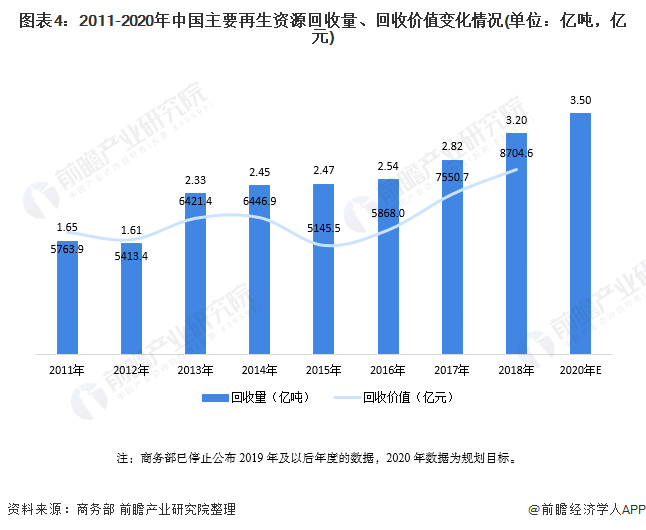 此外,根據(jù)工信部、商務(wù)部、科技部發(fā)布的《關(guān)于加快推進(jìn)再生資源產(chǎn)業(yè)發(fā)展的指導(dǎo)意見》中提出的發(fā)展目標(biāo),到2020年,全國(guó)再生資源回收利用量達(dá)到3.5億噸。