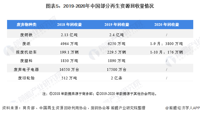 同時(shí),根據(jù)資料的公開程度,前瞻整理了2019-2020年部分再生資源的回收情況,可以看出,與2018年相比,2019年廢棄物的回收量都有所增加,一定程度上說明行業(yè)的回收經(jīng)營(yíng)情況較為穩(wěn)定: