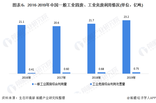 另從加工處置的角度來看,據(jù)生態(tài)環(huán)境部的統(tǒng)計(jì)數(shù)據(jù)顯示,2015-2019年,全國(guó)一般工業(yè)固廢和工業(yè)廢物的綜合利用量總體上升。2019年,全國(guó)一般工業(yè)固廢的綜合利用量為23.2億噸,工業(yè)危廢的綜合利用處置量為0.75億噸。
