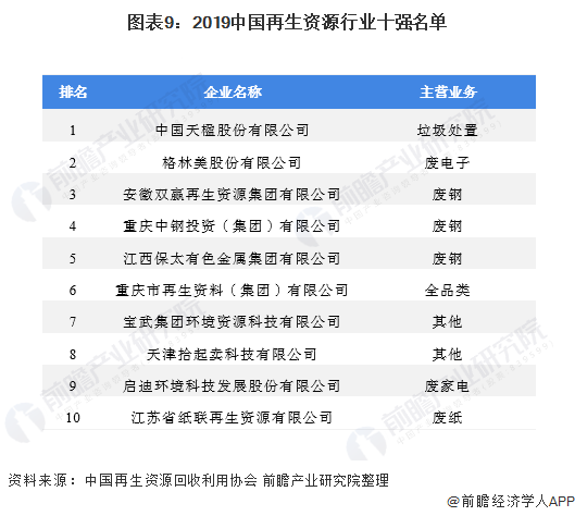 在企業(yè)競(jìng)爭(zhēng)格局方面,由于再生資源行業(yè)的業(yè)務(wù)范圍廣,行業(yè)的競(jìng)爭(zhēng)者數(shù)量較多,但根據(jù)廢棄物種類的不同,各個(gè)企業(yè)的重點(diǎn)業(yè)務(wù)有所不同。2020年12月末,中國(guó)再生資源回收利用協(xié)會(huì)公布了《2019年中國(guó)再生資源行業(yè)50強(qiáng)榜單》,其中,TOP10企業(yè)的排名情況如下,廢鋼回收處利用市場(chǎng)的上榜企業(yè)較多: