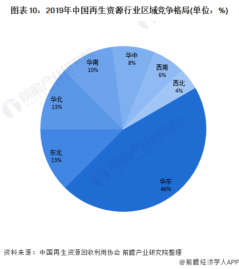在區(qū)域競(jìng)爭(zhēng)格局方面,從2019年我國(guó)再生資源行業(yè)50強(qiáng)企業(yè)的注冊(cè)地分布來看,華東地區(qū)的上榜企業(yè)數(shù)量最多,占比達(dá)46%,其中江蘇省的競(jìng)爭(zhēng)實(shí)力最強(qiáng)。