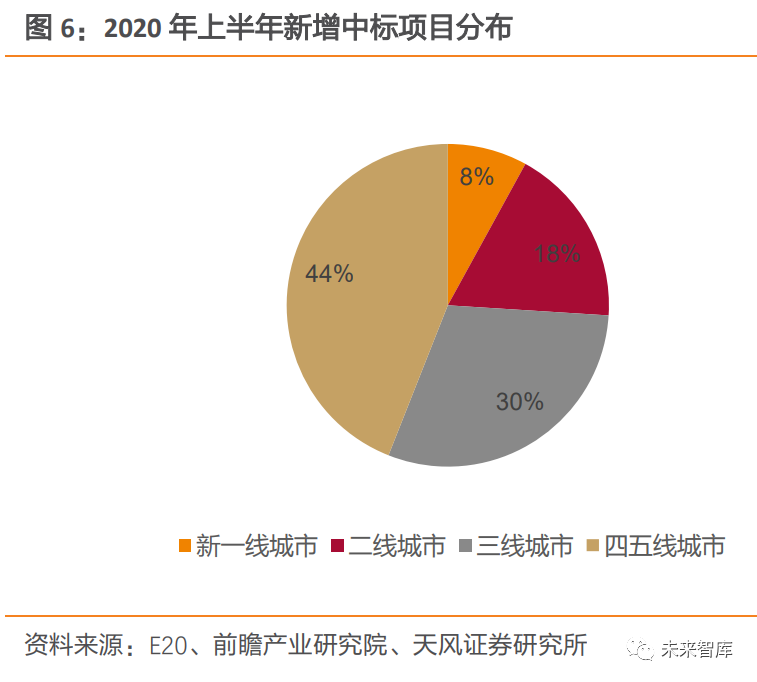 新增產(chǎn)能增速放緩,市場向四五線城市下沉趨勢明顯。2017 年以來,全國垃圾焚燒發(fā)電項(xiàng)目新增投產(chǎn)規(guī)模較大,如2019年新增投產(chǎn)高達(dá) 9.53 萬噸/日。但新增產(chǎn)能增速已由 2017年 53%下降至 2019年 10%。且從 2020 年上半年新增項(xiàng)目區(qū)域分布看,新增的42個垃圾焚燒發(fā)電項(xiàng)目中,一線城市無新增,四五線城市項(xiàng)目數(shù)量占比達(dá) 44%。表明隨著垃圾焚燒行業(yè)快速發(fā)展,一二線城市等經(jīng)濟(jì)較發(fā)達(dá)地區(qū)產(chǎn)能逐漸飽和,行業(yè)整體新增需求增速也有所放緩,市場擔(dān)憂行業(yè)成長性或不可持續(xù)。
