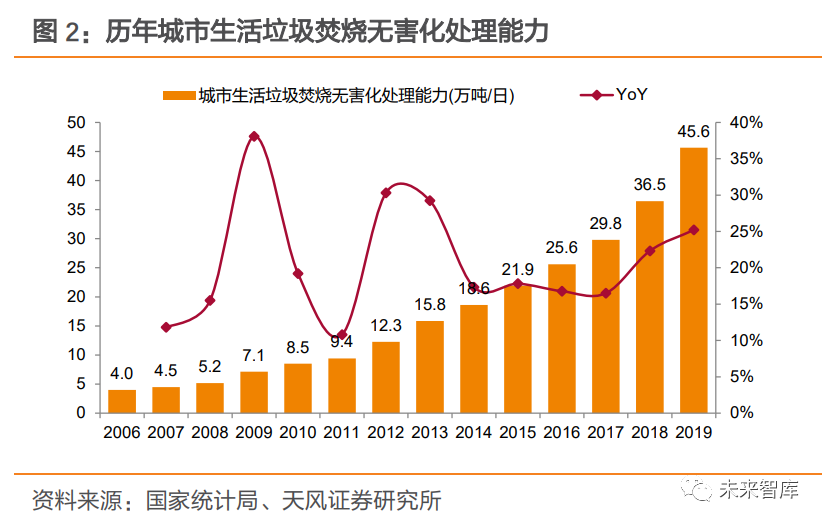 1.1. 新增產(chǎn)能增速放緩+垃圾分類推行,市場擔(dān)憂行業(yè)成長性近年來,我國垃圾焚燒發(fā)電產(chǎn)業(yè)步入快速發(fā)展軌道。以城市為例,生活垃圾焚燒處理廠由2006年69座增長至2019年389座,焚燒處理能力由2006年4.0萬噸/日上升至2019年45.6萬噸/日,提升約10倍。產(chǎn)能擴(kuò)增帶動下,城市生活垃圾焚燒處置量由2006年0.11億噸提升至 2019 年 1.22 億噸,占無害化處置量的比例也由 2006 年 14%提升至 2019年51%??h城垃圾焚燒產(chǎn)業(yè)也在積極推進(jìn),據(jù)住建部最新數(shù)據(jù),2018年縣城焚燒處置量占比達(dá)17%,較2006年提升16%。