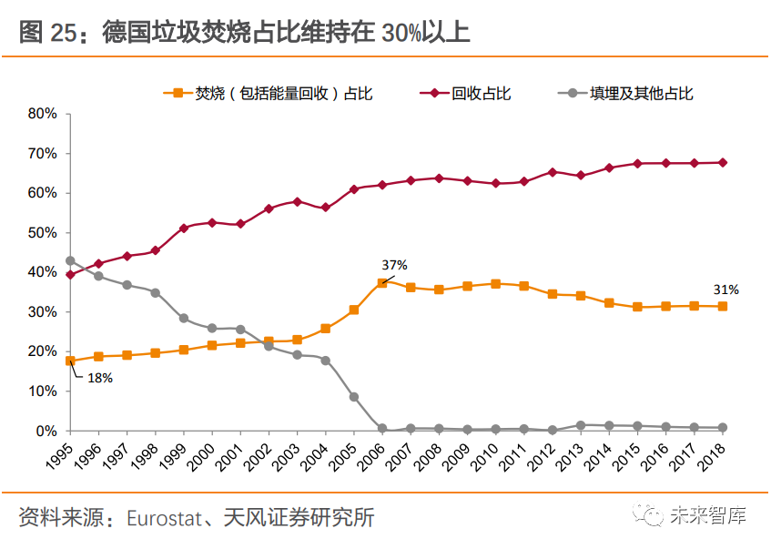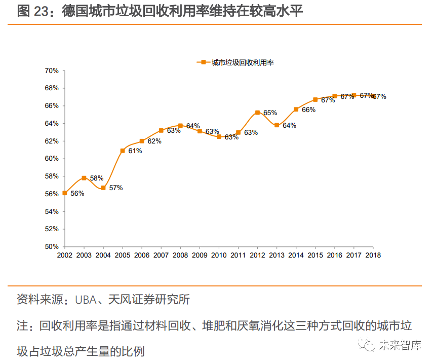 2.1.3. 德國:重視回收循環(huán),“零填埋”政策下焚燒量較穩(wěn)定德國較早開始實(shí)施垃圾分類,回收利用率較高。1992 年,德國在全國建立“綠點(diǎn)制”回收系統(tǒng),與各生產(chǎn)企業(yè)合作,將印有綠點(diǎn)標(biāo)記的、具有再生價值的包裝物回收再利用。2011 年,已經(jīng)有 1.6 萬家德國包裝生產(chǎn)和使用企業(yè)加入了綠點(diǎn)系統(tǒng),超過 90%的商品外包裝印上了綠點(diǎn)標(biāo)記。分類制度推行下,德國城市垃圾總產(chǎn)生量控制良好,由 2002 年的 5277 萬噸變動至 2018 年 5030 萬噸,城市垃圾回收利用率也從 2002 年 56%上升至 2018 年 67%。