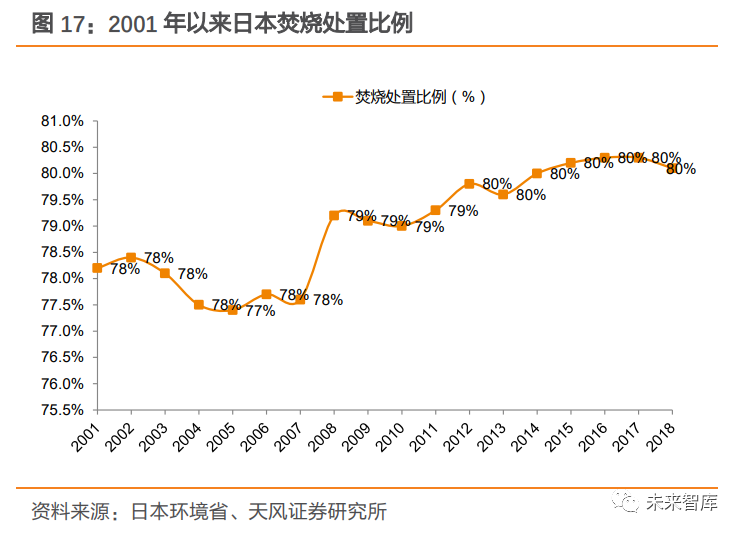21 世紀(jì)以來,行業(yè)步入整合期,焚燒占比維持在高位。1997 年,受“二噁英事件”影響, 日本政府制訂了新的法律來規(guī)范二噁英排放,許多老焚燒廠被迫關(guān)停。政府也要求相鄰的市合作以提高垃圾管理水平,通過建造更大、更高效的焚燒爐減少二噁英排放。同時,政府相應(yīng)改變了國家補(bǔ)貼的發(fā)放門檻,只有大型的焚燒廠才能獲得補(bǔ)貼。在此背景下,日本垃圾焚燒廠經(jīng)歷了環(huán)保去產(chǎn)能及整合階段,焚燒處置量有所下滑,但焚燒占比始終處于高位,2012-2018 年維持在 80%。