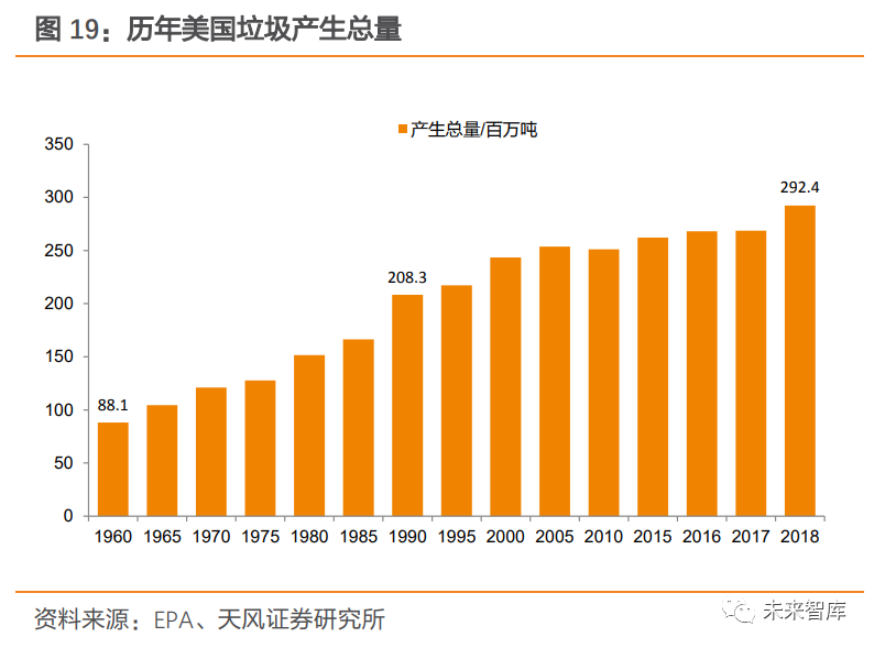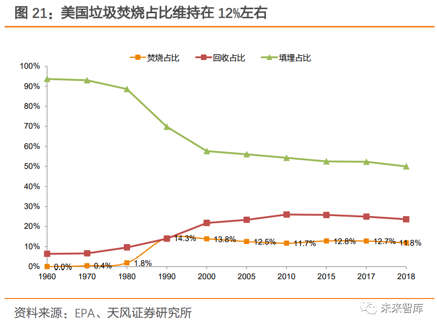 2.1.2. 美國:以填埋為主,焚燒占比維持在 12%左右美國垃圾產(chǎn)生總量及人均垃圾產(chǎn)量趨于平穩(wěn)。1990 年,美國開始建立資源垃圾分類回收系統(tǒng),人均垃圾產(chǎn)量在實(shí)行垃圾分類后開始逐步趨于穩(wěn)定,1990 年人均垃圾產(chǎn)量為 4.57 磅/ 每天,2018年為 4.9 磅/每天;垃圾產(chǎn)生總量則由 1990 年 208.3 百萬噸增加至 2018 年 292.4 百萬噸。