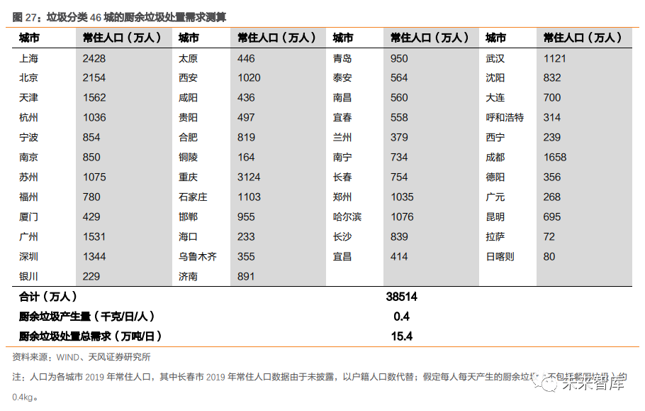 2.2. 展望國內(nèi):垃圾產(chǎn)量及焚燒占比仍處上升通道,焚燒需求將保持旺盛2.2.1. 垃圾分類減量化效果短期較難兌現(xiàn),廚余產(chǎn)能落地是關(guān)鍵影響因素從實(shí)際情況看,垃圾分類減量程度受廚余產(chǎn)能規(guī)模影響。由于有害垃圾占比很小,可回收垃圾在過去資源化利用率也較高,濕垃圾分出量對無害化處置總量影響較大。但在廚余處置產(chǎn)能不足情況下,從分揀前端分離出的濕垃圾,仍需通過焚燒等無害化處置方式進(jìn)行最終解決,會削弱減量化效果。廚余產(chǎn)能缺口較大,許多城市推進(jìn)垃圾分類工作時,仍面臨缺乏專業(yè)大型廚余垃圾處置設(shè)施這一難題。以濕垃圾末端處理設(shè)施建設(shè)進(jìn)度較快的上海為例,截至 2020 年 6 月中旬, 濕垃圾分出量達(dá) 9632.13 噸/日,大于目前濕垃圾處置能力 5050 噸/日。據(jù)我們預(yù)測, 46 個垃圾分類重點(diǎn)城市,每日廚余垃圾(不含餐廚垃圾)處置需求達(dá) 15.4 萬噸。而據(jù) E20 公布,2019 年 5 月底,大規(guī)模廚余垃圾處理廠每日總處理能力合計僅為 0.6 萬噸。