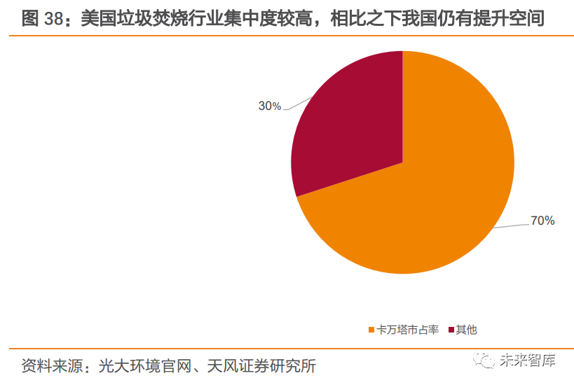 行業(yè)集中度較國外發(fā)達(dá)國家仍有差距,未來有望進(jìn)一步提升。據(jù)卡萬塔公司總裁 2019 年 10 月發(fā)言介紹,卡萬塔在美國市場的占有率已接近 70%。相比之下,我國垃圾焚燒行業(yè)龍頭企業(yè)市占率仍較低,未來有望通過并購整合,繼續(xù)擴(kuò)大市場規(guī)模,行業(yè)集中度或?qū)⑦M(jìn)一步提高。