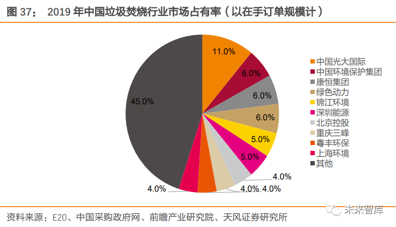 預(yù)計到 2025 年,我國生活垃圾焚燒無害化處理能力將達(dá) 100 萬噸/日,較 2018 年新增產(chǎn)能 59 萬噸/日。2.3. 國內(nèi)行業(yè)集中度提升+海外市場拓展,龍頭增速有望高于行業(yè)垃圾焚燒企業(yè)加速“跑馬圈地”,在手訂單規(guī)模不斷擴(kuò)大。前些年在一系列政策大力支持下,各城市競相建立垃圾焚燒發(fā)電廠,并在國內(nèi)掀起投資并購浪潮。行業(yè)外企業(yè)通過并購快速切入垃圾焚燒領(lǐng)域,行業(yè)內(nèi)企業(yè)借助并購迅速擴(kuò)大自身規(guī)模。例如,2011 年,水務(wù)領(lǐng)域龍頭首創(chuàng)股份通過收購新環(huán)保能源,將業(yè)務(wù)拓展至固廢處理領(lǐng)域;2013 年,瀚藍(lán)環(huán)境收購創(chuàng)冠環(huán)保(中國)有限公司 100%股權(quán),垃圾規(guī)劃處理能力一年內(nèi)提升四倍。并購趨勢下,龍頭企業(yè)在手規(guī)模不斷擴(kuò)大,截至 2019 年,在手訂單規(guī)模前十企業(yè)市占率達(dá) 55%,前三占有率分別為 11/6/6%。