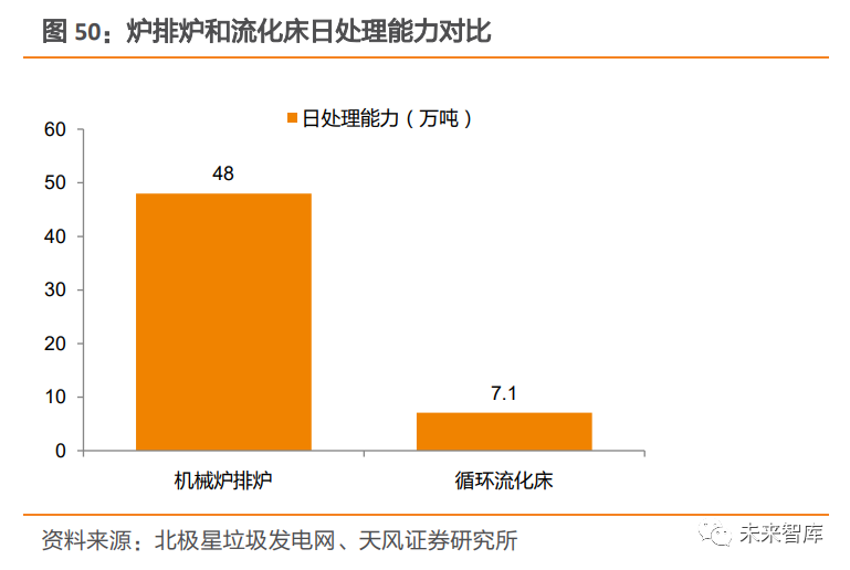 3.2.2. 噸發(fā)電量提升原因二:技術(shù)工藝優(yōu)化爐排爐已成為成熟的技術(shù)路線。垃圾焚燒技術(shù)主要包括流化床焚燒和爐排爐焚燒。在行業(yè)發(fā)展初期,由于國外引進(jìn)的爐排爐焚燒技術(shù)存在不適應(yīng)性以及成本高昂等問題,國內(nèi)自主研發(fā)的流化床焚燒技術(shù)應(yīng)用較多。隨著國產(chǎn)化爐排爐技術(shù)發(fā)展,以及流化床技術(shù)“多飛灰” 不足的凸顯,爐排爐技術(shù)逐漸取代流化床技術(shù),得到快速發(fā)展。從現(xiàn)有爐型分布上看,2020 年,全國已運(yùn)行垃圾焚燒廠 492 座,涉及 1202 臺焚燒爐,其中,機(jī)械爐排爐臺數(shù)占比超過 86%,循環(huán)流化床臺數(shù)占比不到 14%;從處置量來看,全國機(jī)械爐排爐日合計處理能力超過 48 萬噸,循環(huán)流化床日合計處理能力僅為 7 萬 1 千噸左 右。