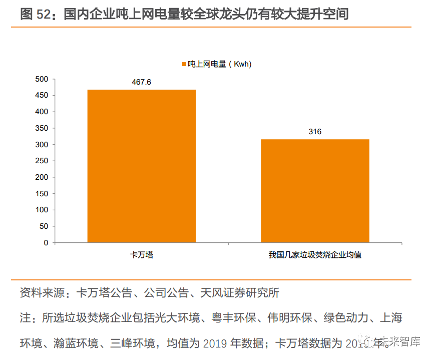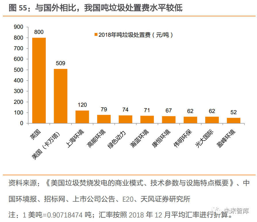 相較于流化床技術(shù),爐排爐技術(shù)因垃圾瀝水量較多、鍋爐效率較高等原因,具有更高的噸上網(wǎng)量,從而帶動垃圾焚燒發(fā)電企業(yè)盈利能力提升。中溫次高壓技術(shù)逐步得到推廣。在過去,受限于生活垃圾的復(fù)雜性以及焚燒發(fā)電技術(shù)處理水平有限,國內(nèi)垃圾焚燒電廠基本采用中溫中壓蒸汽參數(shù)來防止過熱器等受熱面管高溫腐蝕。但據(jù)《生活垃圾焚燒廠噸垃圾發(fā)電量的研究分析》研究表明,垃圾熱值相近的情況下, 使用中溫次高壓參數(shù)時發(fā)電量更高。隨著我國垃圾分類的推進(jìn)及焚燒發(fā)電技術(shù)日益成熟, 部分焚燒廠率先使用中溫次高壓技術(shù)來提高發(fā)電效率。例如在 2009 年,深能源投資的武漢市江北西部垃圾焚燒廠、福建創(chuàng)冠投資的湖北黃石垃圾焚燒發(fā)電廠、在建的北京廊坊垃圾焚燒發(fā)電項(xiàng)目等先后采用中溫次高壓技術(shù),在國內(nèi)掀起應(yīng)用熱潮,中溫次高壓技術(shù)也逐步得到推廣,進(jìn)一步提升噸發(fā)電量。3.2.3. 噸發(fā)電量較國外仍有較大提升空間我國噸發(fā)電量較發(fā)達(dá)國家仍有差距,未來提升空間較大。深圳市生活垃圾處理監(jiān)管中心發(fā)布的文章顯示,美國生活垃圾熱值可達(dá)到我國目前平均水平的兩倍,美國生活垃圾焚燒噸發(fā)電量也在 600kWh 以上,表明我國生活垃圾熱值及噸發(fā)電量仍有較大提升空間。展望未來,垃圾分類制度仍在持續(xù)推進(jìn),焚燒企業(yè)的處理工藝仍在不斷優(yōu)化,噸發(fā)電量提升未來可期,垃圾焚燒企業(yè)盈利能力有望得到持續(xù)優(yōu)化。