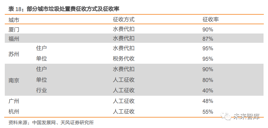 噸發(fā)電量提升30-54 度/噸(提升 10-18%),可對沖政策負(fù)向影響。對一個日處置量 1000 噸的垃圾焚燒項(xiàng)目進(jìn)行測算,假設(shè)在項(xiàng)目補(bǔ)貼結(jié)束后,標(biāo)桿上網(wǎng)電價按 0.45 元/度確認(rèn);在技術(shù)提升所帶來的不同上網(wǎng)電量情景假定下,我們發(fā)現(xiàn),假定其他條件不變,補(bǔ)貼 15 年后退坡,若項(xiàng)目噸發(fā)電量較測算基準(zhǔn)(300 度/噸)提升 30 度/噸(提升 10%),將能維持項(xiàng)目的 IRR 不變(8.8%)。補(bǔ)貼 10 年后退坡,若項(xiàng)目噸發(fā)電量較測算基準(zhǔn)提升 54 度/ 噸(提升 18%),項(xiàng)目的 IRR 也能保持不變。3.3. 收費(fèi)制度逐步完善,垃圾處置費(fèi)有望上調(diào)3.3.1. 國內(nèi)以定額征收為主,財政補(bǔ)貼缺口較大垃圾處置收費(fèi)制度主要包括定額征收及計量征收。定額征收主要指以家庭住戶或者個人作為收費(fèi)單位,不論垃圾排放量的多少,一律按照當(dāng)?shù)卣_定的繳費(fèi)標(biāo)準(zhǔn)進(jìn)行繳費(fèi),收費(fèi)標(biāo)準(zhǔn)較低。計量征收包括按指定垃圾桶數(shù)征收、按垃圾重量征收和按垃圾袋數(shù)量征收等, 與垃圾產(chǎn)生量直接掛鉤。1991 年,我國開始提出對城市垃圾處置實(shí)行服務(wù)性收費(fèi)制度,并于 2018 年首次提出 “按量收費(fèi)”經(jīng)濟(jì)政策。以 2002 年 6 月國家發(fā)改委等部委聯(lián)合頒布《關(guān)于實(shí)行城市生活垃圾處理收費(fèi)制度促進(jìn)垃圾處理產(chǎn)業(yè)化的通知》 為時間節(jié)點(diǎn), 我國正式開征城市生活垃圾處置費(fèi)。自 2011 年起, 一些城市政府高度重視垃圾分類, “按量收費(fèi)”政策在北京與廣州兩個 城市先后醞釀并試點(diǎn)。2018 年 6 月,國家發(fā)改委發(fā)布《關(guān)于創(chuàng)新和完善促進(jìn)綠色發(fā)展價格機(jī)制的意見》,提出 2020 年底前,全國城市及建制鎮(zhèn)全面建立生活垃圾處理收費(fèi)制度, 同時首次明確提出 “按量收費(fèi)”的經(jīng)濟(jì)政策,嘗試以經(jīng)濟(jì)激勵改變行為人的垃圾處置行 為。居民端收費(fèi)以定額為主,非居民端實(shí)現(xiàn)計量征收。①收費(fèi)標(biāo)準(zhǔn):據(jù)國家發(fā)改委的數(shù)據(jù),除沈陽、寧波和上海外,33 個城市制定了居民生活垃圾處置費(fèi)收費(fèi)標(biāo)準(zhǔn),其中,長沙、海口 和烏魯木齊為水消費(fèi)系數(shù)法隨水計征,深圳為按排污水量計征,其他 28 個城市為按戶或按人計征。除沈陽外,35 個城市制定了非居民生活垃圾處理收費(fèi)標(biāo)準(zhǔn)。②收費(fèi)方式:主要 是上門收取和委托代收,采取委托代收的,一般為委托居委會、物業(yè)公司代收,委托稅務(wù)、 工商、財政等部門代收代繳,或與水費(fèi)、燃?xì)赓M(fèi)等公用事業(yè)費(fèi)用聯(lián)合收取等。