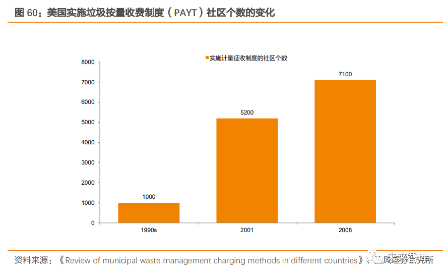 日本多采用單一計量收費(fèi)制。在日本,常見的垃圾收費(fèi)類型有單一計量收費(fèi)制、累進(jìn)計量收費(fèi)制、定量免費(fèi)制、補(bǔ)助組合收費(fèi)制和定額收費(fèi)制 5 種。據(jù)山谷修作的調(diào)查統(tǒng)計,截至2015 年 4 月,日本全國 457 個實(shí)行垃圾收費(fèi)的城市中,有 430 個城市采用單一計量收費(fèi)制,所占比率為 94%。在采用單一計量收費(fèi)制的城市中,單個垃圾袋價格(通常為 40~50L 的大袋)以 30-50 日元(1.92-3.20 人民幣)居多。日本垃圾處理廠建設(shè)資金及運(yùn)營費(fèi)用由財政承擔(dān),財政支出負(fù)擔(dān)加大對垃圾有償收費(fèi)制度的實(shí)施有推動作用。隨著日本垃圾處置費(fèi)用隨處置量與日俱增,財政支出負(fù)擔(dān)加大。例如 北九州市的日明凈工廠,在該地區(qū)未實(shí)施垃圾收費(fèi)制度時,2008 年運(yùn)營收入不及費(fèi)用支出的一半,剩余的運(yùn)營費(fèi)用缺口部分需要依靠財政補(bǔ)貼。據(jù)《日本垃圾處理:政策演進(jìn)、影響因素與成功經(jīng)驗(yàn)》文中介紹,為了緩解財政支出壓力,日本實(shí)施生活垃圾有償收費(fèi)制度的市町村有所上升,以滿足垃圾處置資金需求,體現(xiàn)出財政支出壓力對垃圾收費(fèi)制度的推 動作用。(2)美國:以計量收費(fèi)制為主,垃圾處置費(fèi)由“污染”主體承擔(dān)美國較早推行計量收費(fèi)制。1980s 起,計量收費(fèi)制在美國多個地區(qū)興起。到 2008 年,美國已有 7100 個社區(qū),通過計量收費(fèi)的方式向 7500 萬人征收垃圾處置費(fèi),約占總?cè)丝诘?25%。其采取的計量方式大多是隨垃圾桶或者垃圾袋、垃圾標(biāo)簽征收。以馬薩諸塞州的阿特爾伯勒為例,該地于 2005 年起實(shí)施計量收費(fèi)制度,居民每月需繳納 15 美元,每周可處理 36 加侖以內(nèi)的垃圾,超過則需另外購買購物袋(7.2 加侖的購物袋需支付 1.5 美元)。