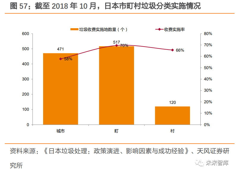 3.3.2. 國外發(fā)達(dá)國家以計量征收為主,征收水平較高相較于定額征收,計量征收對垃圾減量的激勵作用更大,也是國外發(fā)達(dá)國家的主要收費(fèi)方式。由于計量征收與垃圾產(chǎn)生量直接掛鉤,更容易讓居民及企業(yè)端產(chǎn)生 “自己污染、自 己負(fù)責(zé)”的意識,以達(dá)到垃圾減量化的效果。大多數(shù)國外發(fā)達(dá)國家采取計量征收方式。(1)日本:垃圾收費(fèi)實(shí)施率高,多采用單一計量收費(fèi)制日本大規(guī)模實(shí)施垃圾收費(fèi)制度,收費(fèi)實(shí)施率較高。2000 年開始,垃圾收費(fèi)制度在日本得到了大規(guī)模實(shí)施,2000 年至 2018 年 10 月共計新增 330 個垃圾收費(fèi)城市。日本東洋大學(xué)經(jīng)濟(jì)學(xué)系山谷修作教授的調(diào)查統(tǒng)計顯示,截至 2018 年 10 月,日本的城市、町、村收費(fèi)實(shí)施率分別為 57.8%、69.6%和 65.6%。