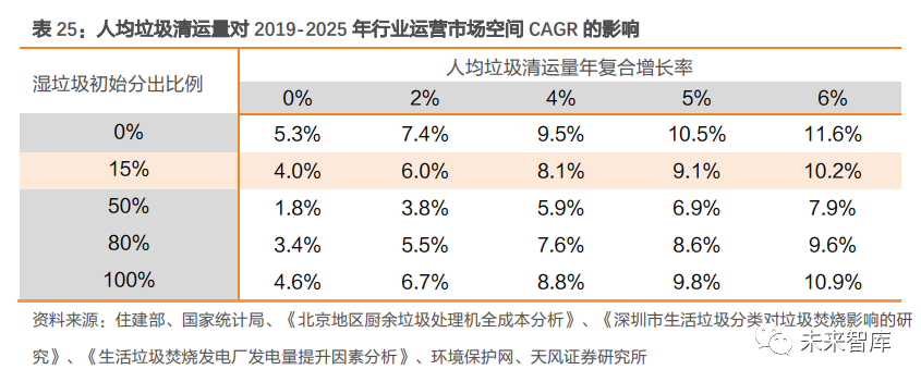 3.3.3. 我國垃圾收費(fèi)政策細(xì)則有望逐步完善,處置費(fèi)有望上調(diào)從國外實(shí)踐看,計量收費(fèi)制度下征收水平較高,能為垃圾焚燒廠處置費(fèi)收入提供更為充足的資金保障,但是否實(shí)施計量收費(fèi)制仍需衡量多方利益。一方面,制定計量收費(fèi)制度需要 更多政策的制定和執(zhí)行成本;另一方面,實(shí)施計量制度還需要用于計量的運(yùn)輸設(shè)備、健全的垃圾回收機(jī)制等。據(jù)《關(guān)于城市生活垃圾不同收費(fèi)制度的思考》文中分析,我國大部分城市未采用計量收費(fèi)制度的原因,除了更多的交易費(fèi)用外,還包括居民責(zé)任意識不強(qiáng)、回收機(jī)制不完全等,且這一制度有可能導(dǎo)致非法傾倒、私自焚燒垃圾等現(xiàn)象。國內(nèi)政策環(huán)境逐步成熟,征收方式有望向計量轉(zhuǎn)變,垃圾處置費(fèi)或?qū)⑸险{(diào)。從全球?qū)嵺`看, 人均 GDP 水平較高、回收體系較健全的發(fā)達(dá)國家更多采用計量收費(fèi)政策。我國人均 GDP 水平正在穩(wěn)步上升,加之垃圾分類、回收體系的不斷健全以及居民環(huán)境意識的逐步增強(qiáng), 垃圾收費(fèi)制度有望向計量征收轉(zhuǎn)變。此外,隨著人工費(fèi)用、燃油和材料等價格上漲,定價部門預(yù)計將按實(shí)際情況細(xì)化收費(fèi)項(xiàng)目,調(diào)整收費(fèi)項(xiàng)目和費(fèi)率,垃圾焚燒企業(yè)垃圾處置費(fèi)也有望上調(diào)。垃圾處置單價上調(diào) 22%-39%可對沖政策負(fù)向影響。國補(bǔ)退坡政策施行后,若想維持項(xiàng)目盈利能力不變,垃圾焚燒企業(yè)可與地方政府協(xié)調(diào),爭取上調(diào)垃圾處置費(fèi),從而確保項(xiàng)目的盈利能力和收入水平。據(jù)我們測算,在補(bǔ)貼 15 年后退坡的假設(shè)下,為維持項(xiàng)目 IRR 不變,政府的垃圾處理單價應(yīng)該從 60 元/噸上調(diào)至 73 元/噸,上調(diào)幅度 22%;10 年后退坡,則應(yīng)上調(diào)至 83 元/噸,上調(diào)幅度 39%。4. 綜合成長及盈利性因素,垃圾焚燒運(yùn)營收入仍有增長空間垃圾分類會帶來“量減”和“熱值提升”雙向影響。垃圾分類一方面會通過提高資源化處置量,影響焚燒處置量;另一方面也通過降低生活垃圾中濕垃圾占比,帶動入爐垃圾熱值提升,使得噸發(fā)電量同步提升。綜合考慮垃圾分類帶來的“量減”+“熱值升”,以及城鎮(zhèn)化率提升、技術(shù)工藝優(yōu)化等影響因素,據(jù)我們測算,2019-2025 年垃圾焚燒行業(yè)運(yùn)營收入 GAGR 約 7%,垃圾分類減量化影響下仍有增長空間。①生活垃圾各成分占比:假定濕垃圾、可回收垃圾及干垃圾占比分別為 55%、10%、35%。由于有害垃圾占比很小,暫不考慮有害垃圾的影響。②分出比例:假定濕垃圾與可回收垃圾的分出比例相同,2019 年設(shè)定為 15%,隨著分類體 系的健全,逐年提升 10%。③濕垃圾回收處置率:假定 2019 年濕垃圾回收處置率 40%,并隨著廚余處置產(chǎn)能擴(kuò)增,逐年提升 10%。④殘?jiān)急?/span>:由于濕垃圾資源化處置后的廢渣仍需通過焚燒進(jìn)行最終處置,假定殘?jiān)急?20%。⑤由垃圾分類導(dǎo)致的噸發(fā)提升量:據(jù)《深圳市生活垃圾分類對垃圾焚燒影響的研究》相關(guān)內(nèi)容,我們推算出當(dāng)濕垃圾在入爐垃圾中的占比降低 1% 時,噸垃圾發(fā)電量可以提升 2.2-3.0Kwh,保守假定濕垃圾占比下降 1%會帶來噸發(fā)電量提升 2.2Kwh。⑥由技術(shù)工藝優(yōu)化導(dǎo)致的噸發(fā)提升量:據(jù)《生活垃圾焚燒發(fā)電廠發(fā)電量提升因素分析》介紹,李坑一廠借助中溫超高壓技術(shù),噸垃圾發(fā)電量達(dá) 350~360kWh,以及在垃圾熱值相近 的情況下,中溫次高壓余熱鍋爐發(fā)電量增加 17%。我們假定技術(shù)優(yōu)化帶來噸發(fā)電量提升50Kwh,由2019年300Kwh線性提升至2025年350Kwh。⑦噸垃圾處置費(fèi)及年復(fù)合增長率:假定 2019 年噸垃圾處置費(fèi)單價 70 元,未來每年按 CPI 增速 3%增長。城鎮(zhèn)化率提升+人均垃圾清運(yùn)量提升+技術(shù)優(yōu)化三道屏障,可對沖垃圾分類減量影響,運(yùn)營總收入市場空間有望保持增長。若從靜態(tài)時點(diǎn)單獨(dú)分析垃圾分類對焚燒量的影響,在 2019 年數(shù)據(jù)及相關(guān)假設(shè)的基礎(chǔ)上,相較于垃圾分類前,隨著濕垃圾分出比例提升,焚燒處置量下滑程度加大。但從長期動態(tài)視角看,在城鎮(zhèn)化率、人均垃圾清運(yùn)量、焚燒占比共同提升趨勢下,焚燒需求仍將保持旺盛,疊加垃圾分類及技術(shù)進(jìn)步驅(qū)動下的噸上網(wǎng)電量提升,垃圾焚燒廠運(yùn)營收入市場空間有望保持正增長。