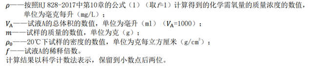 試樣中化學需氧量(CODCr)以質(zhì)量濃度ρ1計,單位以毫克每升(mg/L)表示,按式(1)計算: