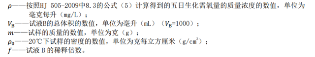 試樣中五日生化需氧量(BOD5)以質(zhì)量濃度ρ2計,單位以毫克每升(mg/L)表示,按式(2)計算: