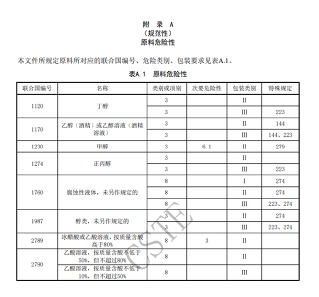 本文件所規(guī)定原料所對應(yīng)的聯(lián)合國編號、危險類別、包裝要求見表A.1。
