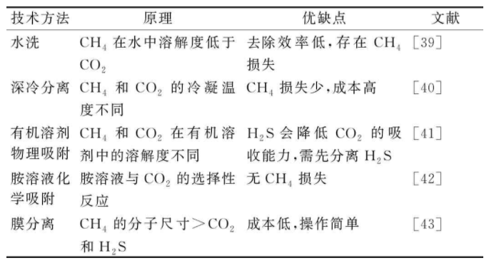 廚余垃圾厭氧消化的產(chǎn)物沼氣成分復雜,包括CH4、CO2、N2、H2S和硅氧烷等。其中:1)CO2含量越高,沼氣中的熱值越低;2)除甲烷外,沼氣中其他氣體是沼氣污染物。H2S和NH3具有極強的腐蝕性,燃燒后產(chǎn)生的SO2會破壞熱電聯(lián)產(chǎn)裝置和金屬部件。而硅氧烷,即使?jié)舛群苄?,但燃燒后產(chǎn)生的硅膠類氧化物能殘留沉積在燃燒設備的引擎和閥門上造成故障。這些原因都會導致厭氧消化產(chǎn)生的沼氣不能直接利用,因此需要通過物理化學技術、生物技術等對產(chǎn)生的沼氣進行凈化和升級,以提高熱值,將其轉(zhuǎn)化為更高標準的燃料能源。常規(guī)的沼氣凈化升級方法總結(jié)見表2。