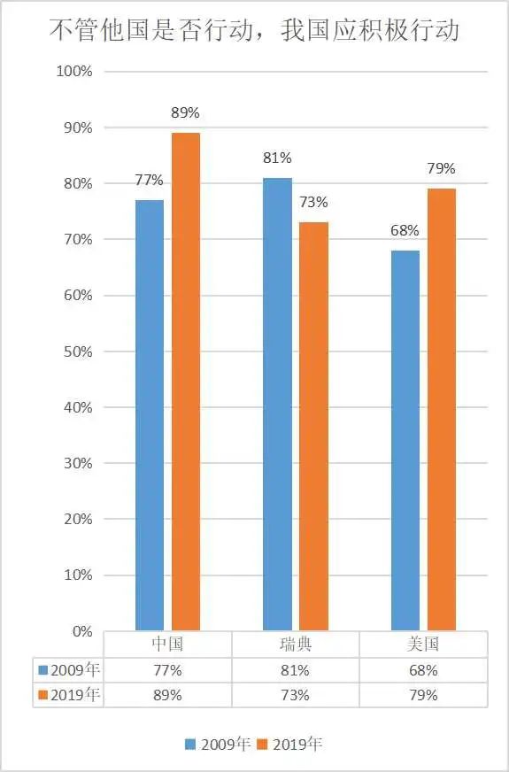 中國受訪者對(duì)我國應(yīng)該積極擔(dān)負(fù)起全球氣候變化和環(huán)境治理的領(lǐng)導(dǎo)責(zé)任,有了更高的支持和信心,且支持度遠(yuǎn)高于美國和瑞典。