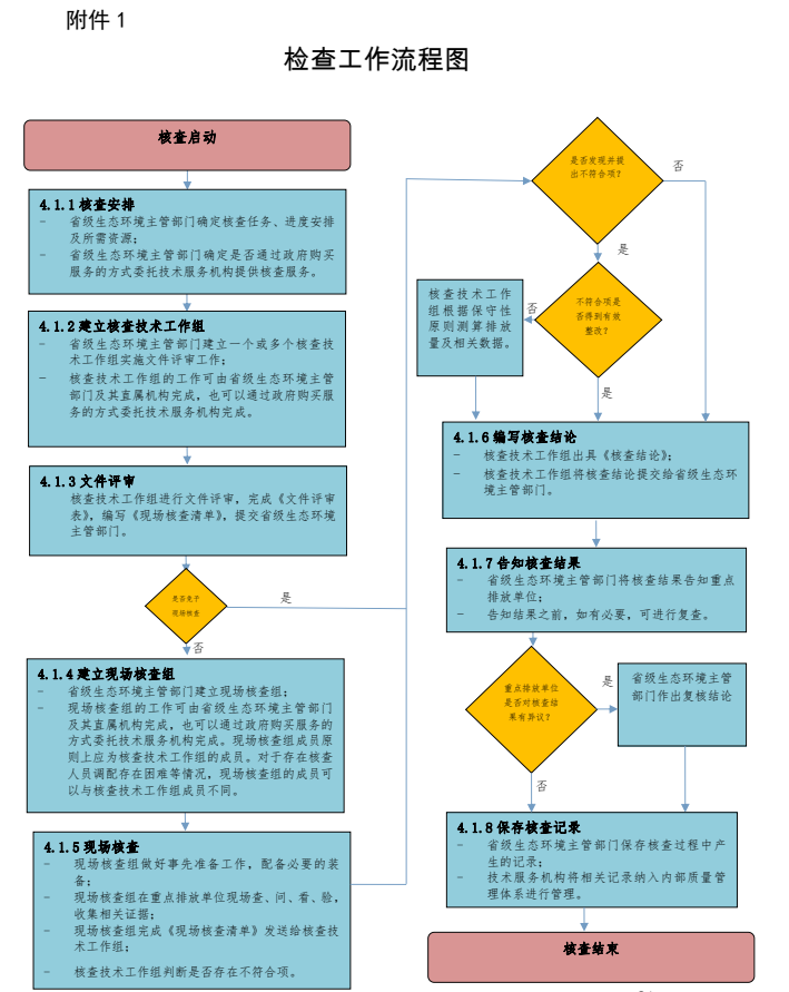 核查程序包括核查安排、建立核查技術(shù)工作組、文件評審、建立現(xiàn)場核查組、實施現(xiàn)場核查、出具《核查結(jié)論》、告知核查結(jié)果、存核查記錄等八個步驟,核查工作流程圖見附件1。