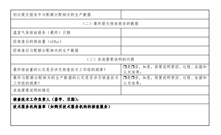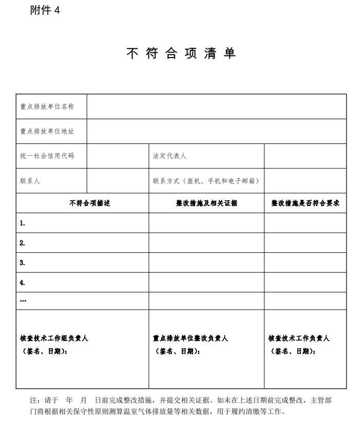 技術(shù)工作組應(yīng)在收到《現(xiàn)場核查清單》后2個工作日內(nèi),對《現(xiàn)場核查清單》中未取得有效證據(jù)、不符合核算指南要求以及未按數(shù)據(jù)質(zhì)量控制計劃執(zhí)行等情況,在《不符合項清單》(見附件4)中“不符合項描述”一欄如實記錄,并要求重點排放單位采取整改措施。重點排放單位應(yīng)在收到《不符合項清單》后的5個工作日內(nèi),填寫完成《不符合項清單》中“整改措施及相關(guān)證據(jù)”一欄,連同相關(guān)證據(jù)材料一并提交技術(shù)工作組。技術(shù)工作組應(yīng)對不符合項的整改進行書面驗證,必要時可采取現(xiàn)場驗證的方式。