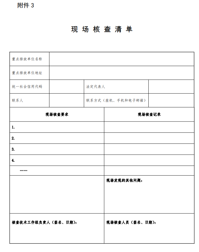現(xiàn)場核查組應(yīng)按照《現(xiàn)場核查清單》做好準備工作,明確核查任務(wù)重點、組內(nèi)人員分工、核查范圍和路線,準備核查所需要的裝備,如現(xiàn)場核查清單、記錄本、交通工具、通信器材、錄音錄像器材、現(xiàn)場采樣器材等?,F(xiàn)場核查組應(yīng)于現(xiàn)場核查前2個工作日通知重點排放單位做好準備。