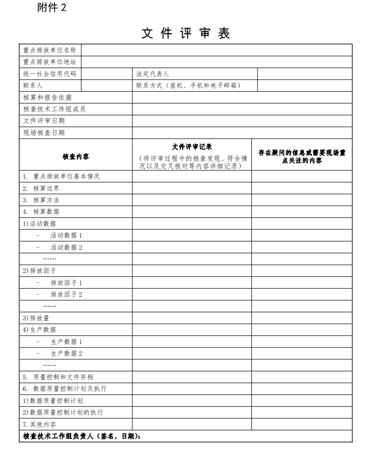 技術(shù)工作組應(yīng)根據(jù)相應(yīng)行業(yè)的溫室氣體排放核算方法與報告指南(以下簡稱核算指南)、相關(guān)技術(shù)規(guī)范,對重點排放單位提交的排放報告及數(shù)據(jù)質(zhì)量控制計劃等支撐材料進行文件評審,初步確認重點排放單位的溫室氣體排放量和相關(guān)信息的符合情況,識別現(xiàn)場核查重點,提出現(xiàn)場核查時間、需訪問的人員、需觀察的設(shè)施、設(shè)備或操作以及需查閱的支撐文件等現(xiàn)場核查要求,并按附件2和附件3的格式分別填寫完成《文件評審表》和《現(xiàn)場核查清單》提交省級生態(tài)環(huán)境主管部門。