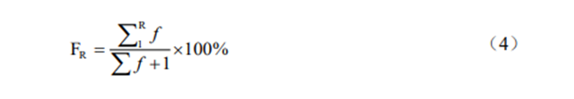 將 lgSMAV 和 lgSMCV 從小到大分別進行排序,確定其秩次 R(數(shù)值最小的秩次為1,次之秩次為 2,依次排列,如果有兩個或兩個以上物種的數(shù)值相同,將其任意排成連續(xù)秩次),分別計算物種的急性和慢性累積頻率 FR,計算方法見公式(4):