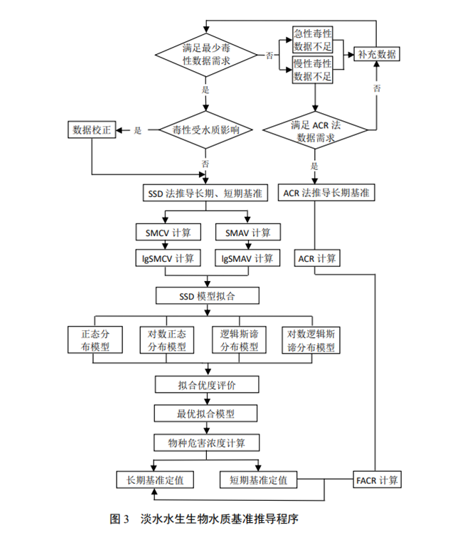 采用 SSD 法推導淡水水生生物水質基準,利用適宜的模型對物種敏感度的分布進行擬合后,計算出能保護 95%生物的污染物濃度,經(jīng)評估因子外推后獲得基準。包括毒性數(shù)據(jù)預處理、模型擬合與評價、物種危害濃度確定和基準定值等步驟,推導程序見圖 3。