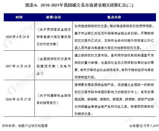碳排放權(quán)交易體系是實(shí)現(xiàn)低成本碳減排的關(guān)鍵。2016-2021年是我國(guó)碳交易市場(chǎng)的黃金時(shí)期,我國(guó)出臺(tái)了一系列政策建立包括建立相關(guān)綠色金融、碳中和等來(lái)推動(dòng)碳交易市場(chǎng)發(fā)展,具體政策匯總?cè)缦拢?/div>