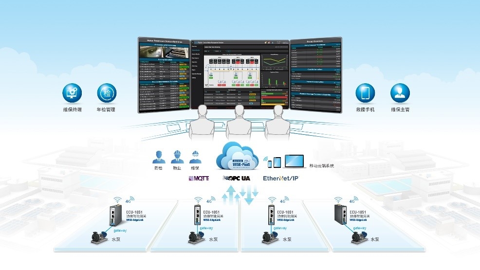 當前很多的泵站監(jiān)控仍以人工方式進行現(xiàn)場啟停,誤操作/延遲操作等情況時有發(fā)生,導(dǎo)致監(jiān)測不精準,監(jiān)管不到位,事故頻發(fā)。研華ECU-1051系列智能網(wǎng)關(guān)支持多種型號的PLC控制器的數(shù)據(jù)采集,并可以通過MQTT協(xié)議直接對接運營商所選的云平臺Webaccess為BS架構(gòu)組態(tài)軟件,有效采集、展示、分析數(shù)據(jù)。通過遠程控制方式對于現(xiàn)場設(shè)備進行實時、準確的監(jiān)測及故障預(yù)警,遠程分級監(jiān)控管理設(shè)備狀況,實現(xiàn)設(shè)備、人、數(shù)據(jù)、流程的互聯(lián)互通,無縫對接企業(yè)ERP/CRM/手機APP系統(tǒng)遠程資產(chǎn)管理設(shè)備位置信息建立產(chǎn)品知識庫,優(yōu)化產(chǎn)品性能及供應(yīng)鏈管理,提高產(chǎn)品競爭力。