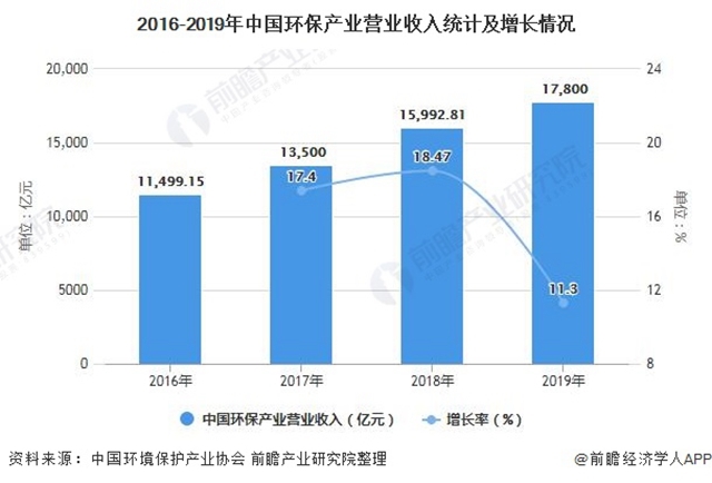 盡管受到2018年產(chǎn)業(yè)發(fā)展流動性危機余波及中美貿(mào)易摩擦的影響,2019年一些環(huán)保企業(yè)依然面臨著經(jīng)營危機,但總體來看,2019年環(huán)保產(chǎn)業(yè)整體發(fā)展態(tài)勢趨好,持續(xù)保持了較快發(fā)展。據(jù)中國環(huán)境保護產(chǎn)業(yè)協(xié)會測算數(shù)據(jù),2019年全國環(huán)保產(chǎn)業(yè)營業(yè)收入約17800億元,較2018年增長約11.3%。