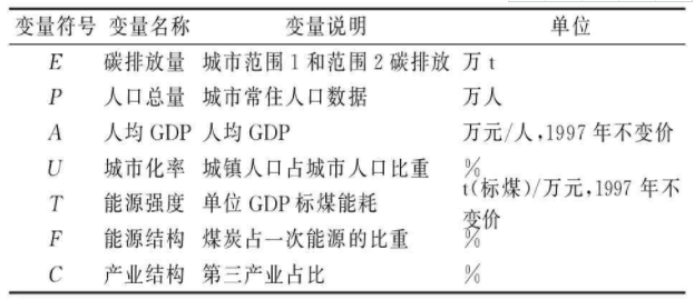 其中:P為人口規(guī)模;A為人均富裕程度;T為技術(shù)水平;a為人口規(guī)模系數(shù);b為人均富裕程度系數(shù);c為技術(shù)水平系數(shù);e為隨機環(huán)境誤差。因變量I為環(huán)境影響程度,如CO2排放量,該模型是STIRPAT方程的隨機形式,可對各因素對環(huán)境造成的非比例影響進行研究(表2)。除上述自變量外,其他可以對環(huán)境造成影響的因素也可引入該模型進行擴展,從而分析其對環(huán)境的影響。本文選取人口總量(P)、人均GDP(A)、城市化率(U)、能源強度(T)、能源結(jié)構(gòu)(F)和產(chǎn)業(yè)結(jié)構(gòu)(C)6項因素作為自變量對STIRPAT模型進行擴展,得到擴展后的模型見式(1)。