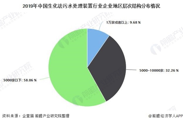 根據(jù)企查貓的數(shù)據(jù)顯示,截止到2019年年底,我國(guó)生化法污水處理裝置行業(yè)企業(yè)地區(qū)呈現(xiàn)三個(gè)階梯隊(duì)伍: