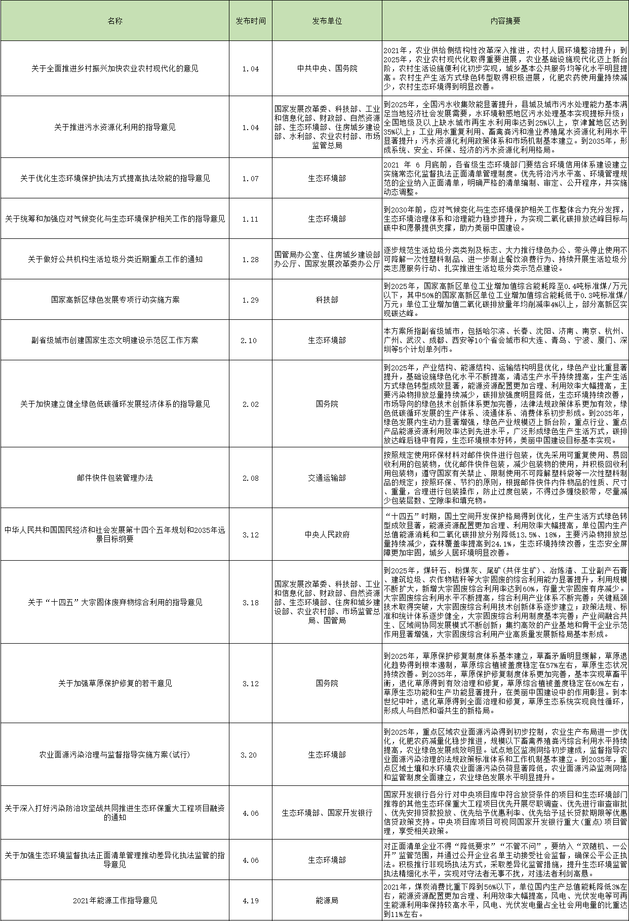 《關(guān)于統(tǒng)籌和加強應(yīng)對氣候變化與生態(tài)環(huán)境保護相關(guān)工作的指導(dǎo)意見》明確指出,要為實現(xiàn)二氧化碳排放達峰目標(biāo)與碳中和愿景提供支撐;《關(guān)于加快建立健全綠色低碳循環(huán)發(fā)展經(jīng)濟體系的指導(dǎo)意見》要求,到2025年,綠色低碳循環(huán)發(fā)展的生產(chǎn)體系、流通體系、消費體系初步形成。