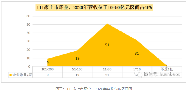 111家上市環(huán)企,2020年營收在51億元-100億元區(qū)間有19家,龍馬環(huán)衛(wèi)、興蓉環(huán)境首次擠進(jìn)50億元營收陣營;而營收在10億元-50億元區(qū)間的上市環(huán)企,有51家,約占半數(shù);營收區(qū)間位于1億元-10億元的“小而美”上市環(huán)企,有31家,它們大多是科創(chuàng)板企業(yè)(如圖三所示)。