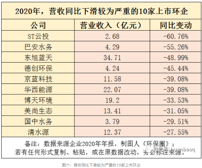 相比上述企業(yè)的出彩表現(xiàn),接下來圖六表格中的ST云投、巴安水務(wù)、東旭藍(lán)天、華西能源、國中水務(wù)、清水源等10家上市環(huán)企的表現(xiàn)則不盡如意,2020年營業(yè)收入下滑較為嚴(yán)重,降幅最大的前三分別是ST云投、巴安水務(wù)、東旭藍(lán)天。