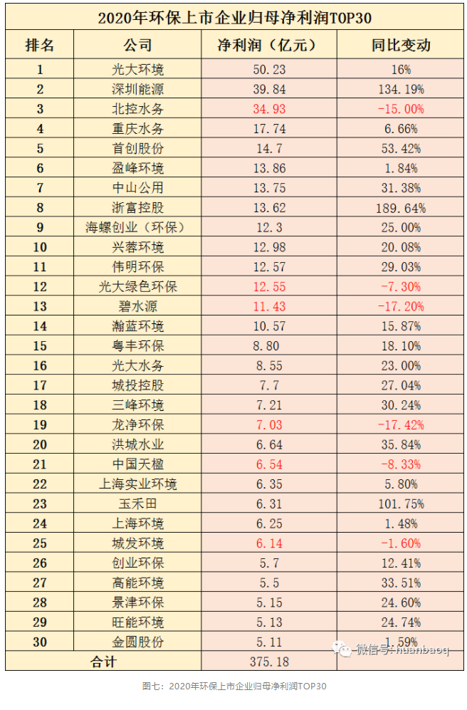 不過,TOP30強中,像業(yè)內(nèi)比較熟悉明星上市環(huán)企,北控水務(wù)、光大綠色環(huán)保、碧水源、龍凈環(huán)保、中國天楹、城發(fā)環(huán)境等,2020年歸母凈利潤都遭到不同程度下滑。