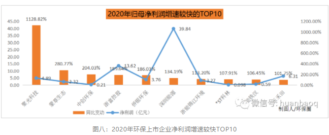 在外界宏觀條件不利、疫情生死攸關(guān)的2020年,仍有一些上市環(huán)企脫穎出來,從凈利潤增速來看,2020年增速較快TOP10上市環(huán)企非常有看點(如圖八所示)。
