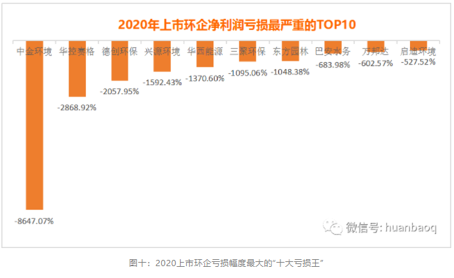 如果要在這20家虧損企業(yè)中,找到2020上市環(huán)企虧損幅度最大的“十大虧損王”,如圖十所示中金環(huán)境、德創(chuàng)環(huán)保、華控賽格、興源環(huán)境、三聚環(huán)保、東方園林、巴安水務(wù)、萬邦達(dá)、啟迪環(huán)境、清水源都“榜上有名”。