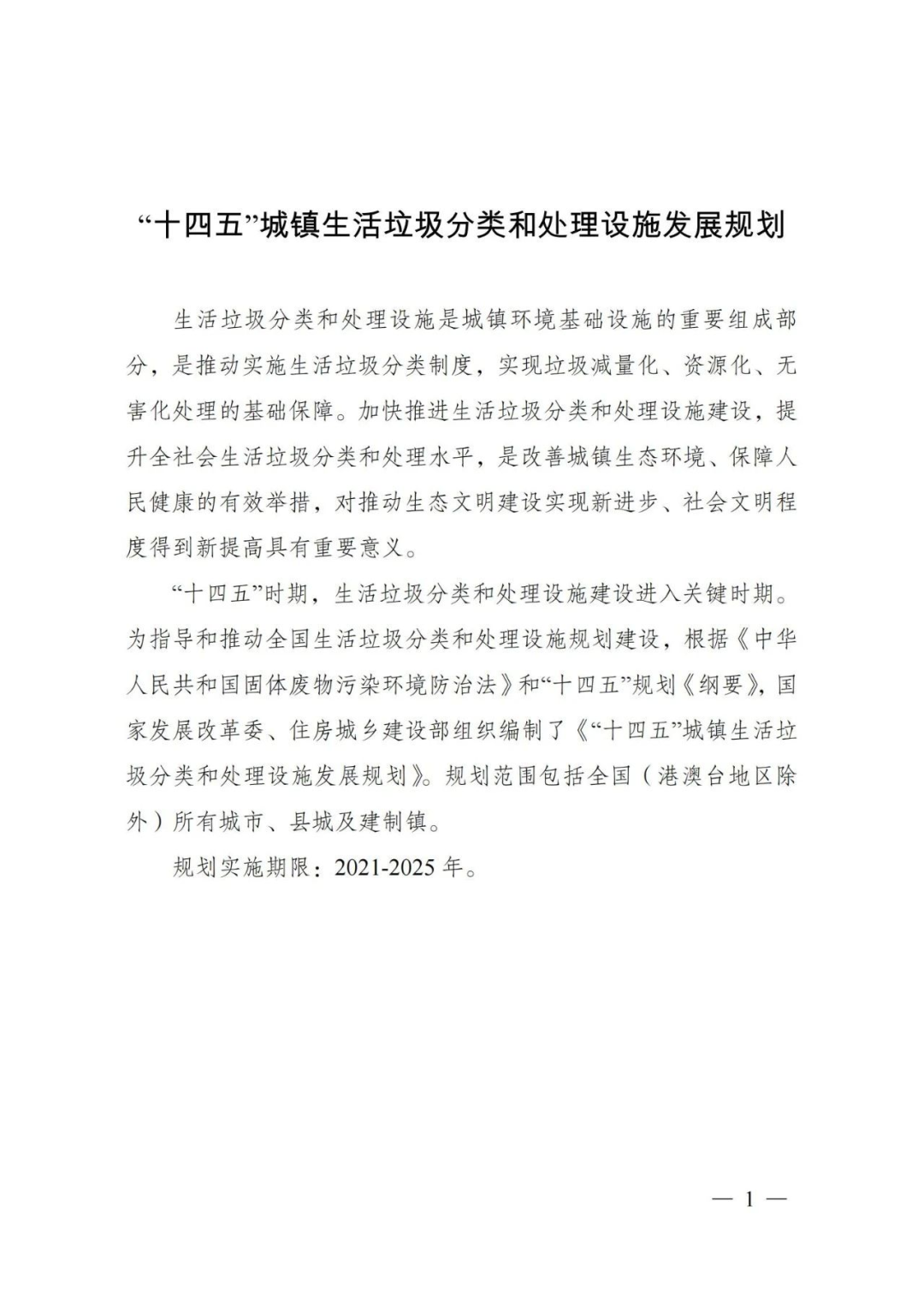 為深入貫徹習(xí)近平總書記關(guān)于生活垃圾分類的重要批示指示精神,落實(shí)黨中央、國(guó)務(wù)院決策部署要求,統(tǒng)籌推進(jìn)“十四五”城鎮(zhèn)生活垃圾分類和處理設(shè)施建設(shè)工作,加快建立分類投放、分類收集、分類運(yùn)輸、分類處理的生活垃圾處理系統(tǒng),國(guó)家發(fā)展改革委、住房城鄉(xiāng)建設(shè)部組織編制了《“十四五”城鎮(zhèn)生活垃圾分類和處理設(shè)施發(fā)展規(guī)劃》?,F(xiàn)印發(fā)你們,請(qǐng)遵照?qǐng)?zhí)行。